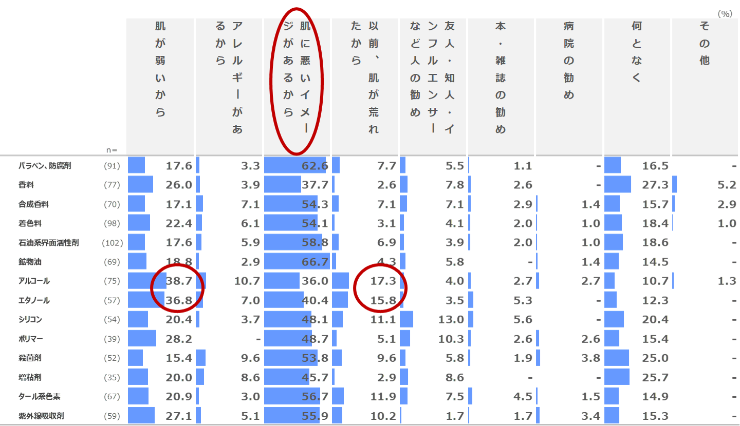 各成分について「肌に悪いイメージがあるから」「肌が弱いから」が理由に挙がる一方、「何となく」も一定数存在。