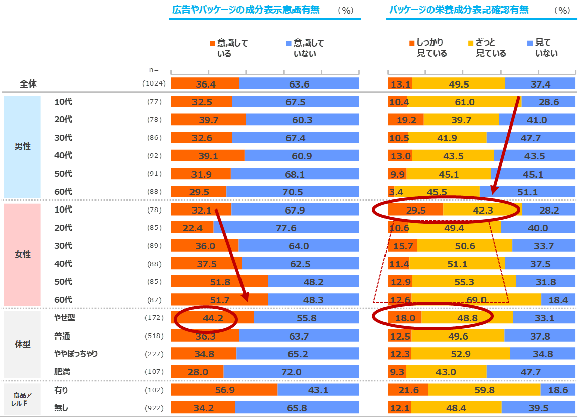 広告/パッケージの成分表示を意識している人は全体で36.4%、栄養成分表記を確認している人は62.6%。