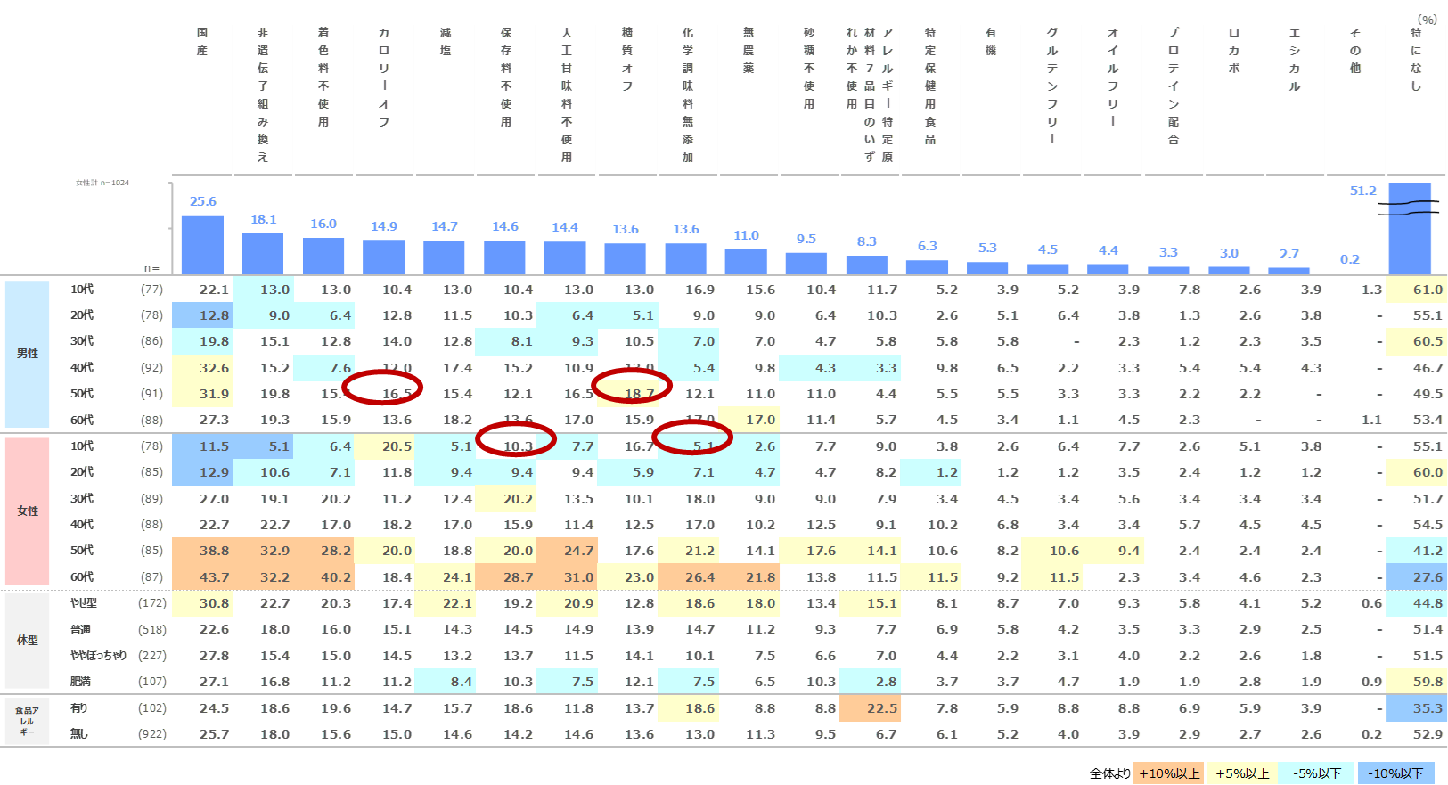 ■「特になし」が51.2%と半数を超えるが、全体的に特に女性で年代が上がるにつれて「入っていないか必ず確認する成分」が増える傾向です。若い世代では確認する成分が比較的少ない中、10代女性は「カロリーオフ」が全体より+5.6pts、「糖質オフ」が+3.1pts多く、ダイエット関連の表示への意識が高い。30代女性は「保存料不使用」が全体より+5.6pts、「化学調味料無添加」が+4.4pts多く、品質へのこだわりが出始める年代と推察されます。(図表5)