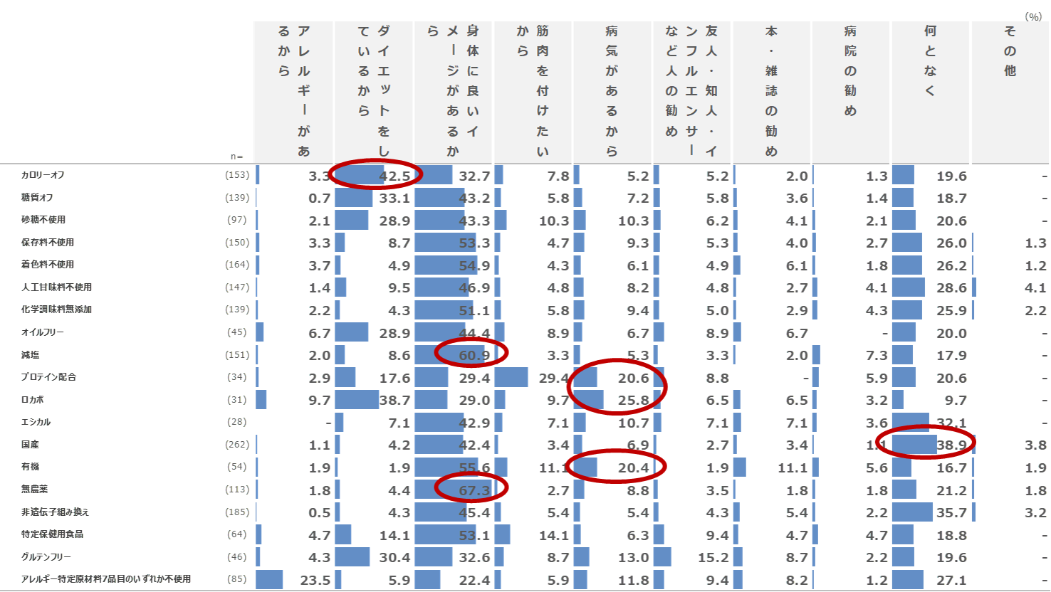 ■「ダイエットをしているから」では、「ロカボ」38.7%、「糖質オフ」33.1%をおさえて「カロリーオフ」が42.5%と最も多い結果となりました。「病気があるから」では、「ロカボ」25.8%、「プロテイン配合」20.6%、「有機」20.4%が上位に挙がっています。前問で「表記されているか確認するもの」として「国産」が第1位に挙がっており、「身体に良いイメージがあるから」42.4%が理由にある一方、「何となく」38.6%が他の表記よりも最も多く挙がりました。(図表6)
