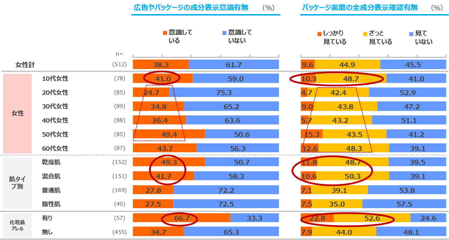 ■全体的に年代があがるにつれて広告/パッケージの成分表示への意識や、パッケージ裏面の全成分表示の確認をしている人が増える傾向にありますが、例外として10代は全体と比較して表示への意識・確認が高いようです。また、表示への意識や全成分表示の確認は「乾燥肌」「混合肌」が他の肌質よりも+10pts以上も高く、アレルギー「有り」も「無し」より+20pts以上も高い結果となりました。(図表1)