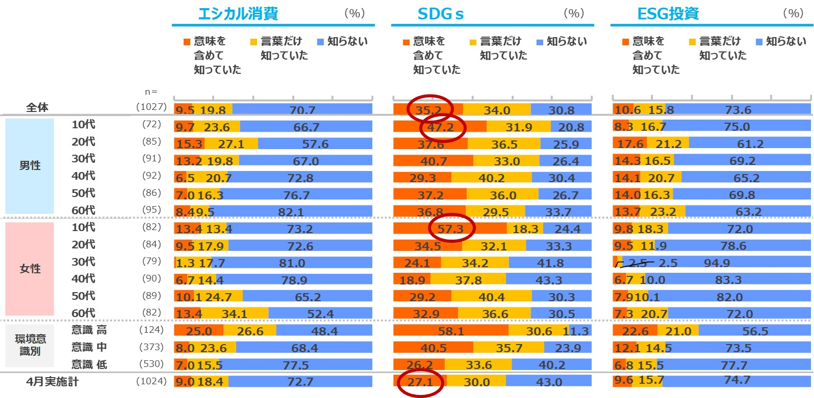 「SDGs」の認知は7割と4月時点から+8.1pts上昇。10代では男女ともに「意味を含めて知っていた」が最も高い。「エシカル消費」「ESG投資」は3割程度の認知に留まる。