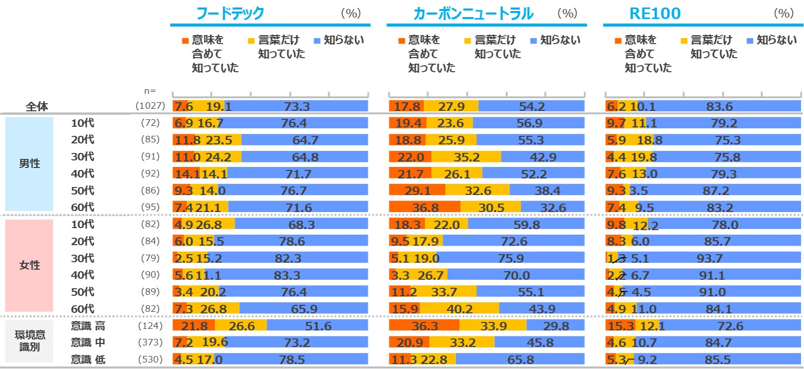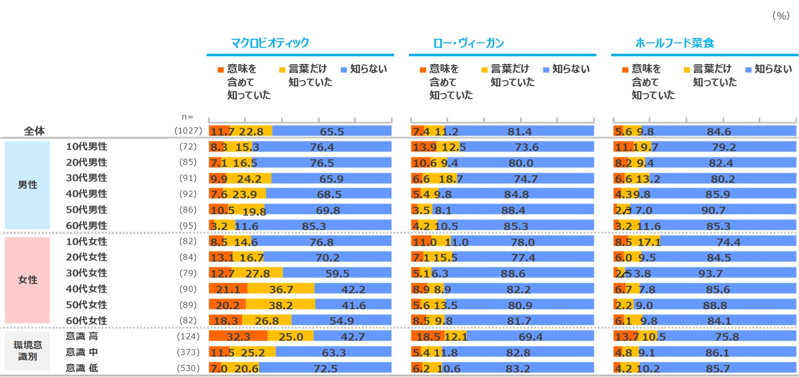 「菜食主義」の全体認知は8割弱。20代では男女ともに「意味を含めて知っていた」が「菜食主義」「ヴィーガン」で半数以上。