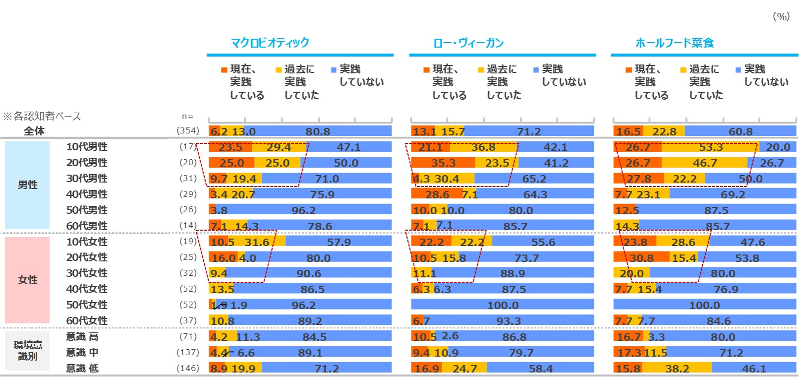■前問で全体認知が8割であった「菜食主義」でも実践経験者は1割に留まる中、10代の実践経験者は男女とも2~3割と、10代~30代の若年層での経験者が多い結果となりました。10代~30代の若年層において実践経験者が多く、特に10代が最も多い傾向(ロー・ヴィーガン(男性)を除く)は、他の食事法全般でも同様で、前問の認知との関連性は見られませんでした。一方で、環境意識別では、認知は環境意識が高い層の認知が高い傾向にありますが、実践経験者は環境意識が低い層の方が相対的に高い傾向にあります。(図表5、6)