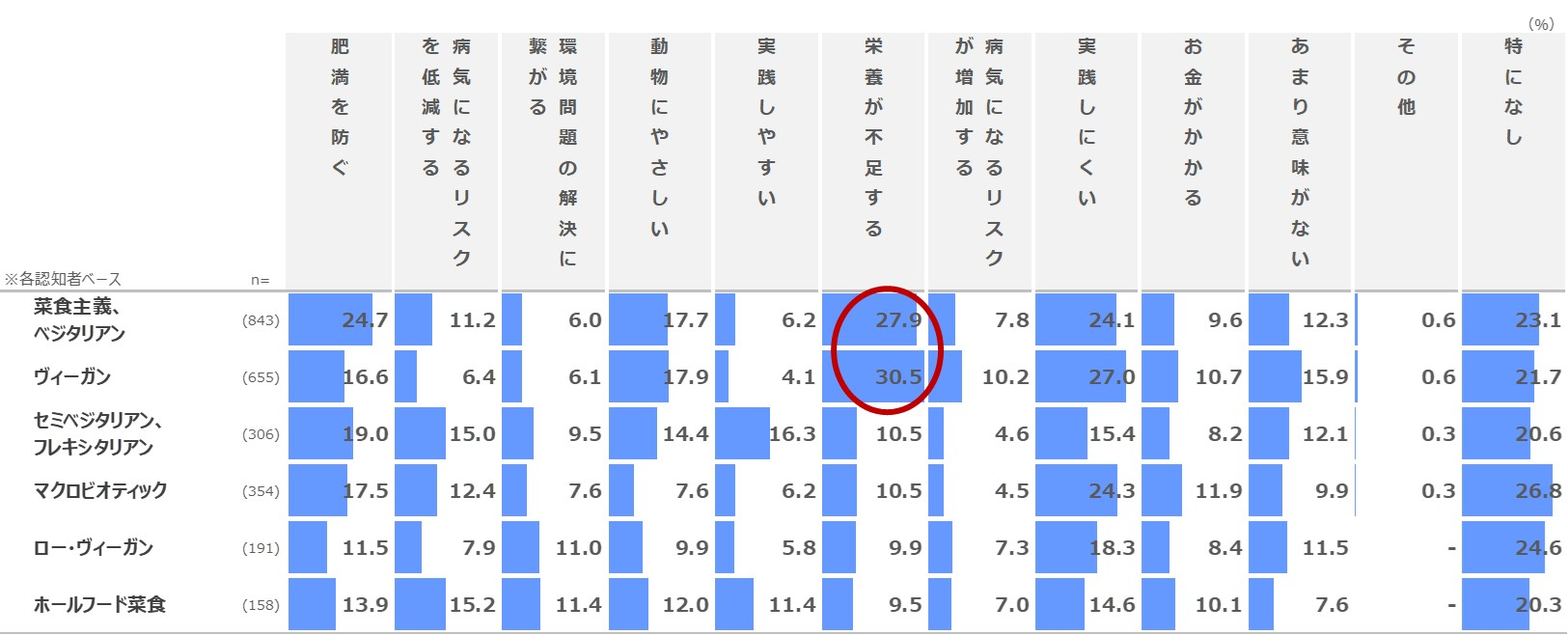 ■認知が高い「菜食主義」では、「肥満を防ぐ」というポジティブな印象が2割強ある一方、「栄養が不足する」というネガティブな理由が3割弱、「実践しにくい」が2割強を占めています。年代別では、実践経験者が多い10代~30代でネガティブな理由も挙がる一方、ポジティブな理由も相対的に多い結果です。特に、実践経験者が最も多い10代では、ポジティブな理由を挙げる人が他の年代より相対的に多い傾向です。一方で、実践経験者が多い「環境意識が低い層」では、前述の年代別の傾向とは異なり、特にポジティブな理由が他の意識層と比べて多く挙がる傾向は見られませんでした。(図表7)