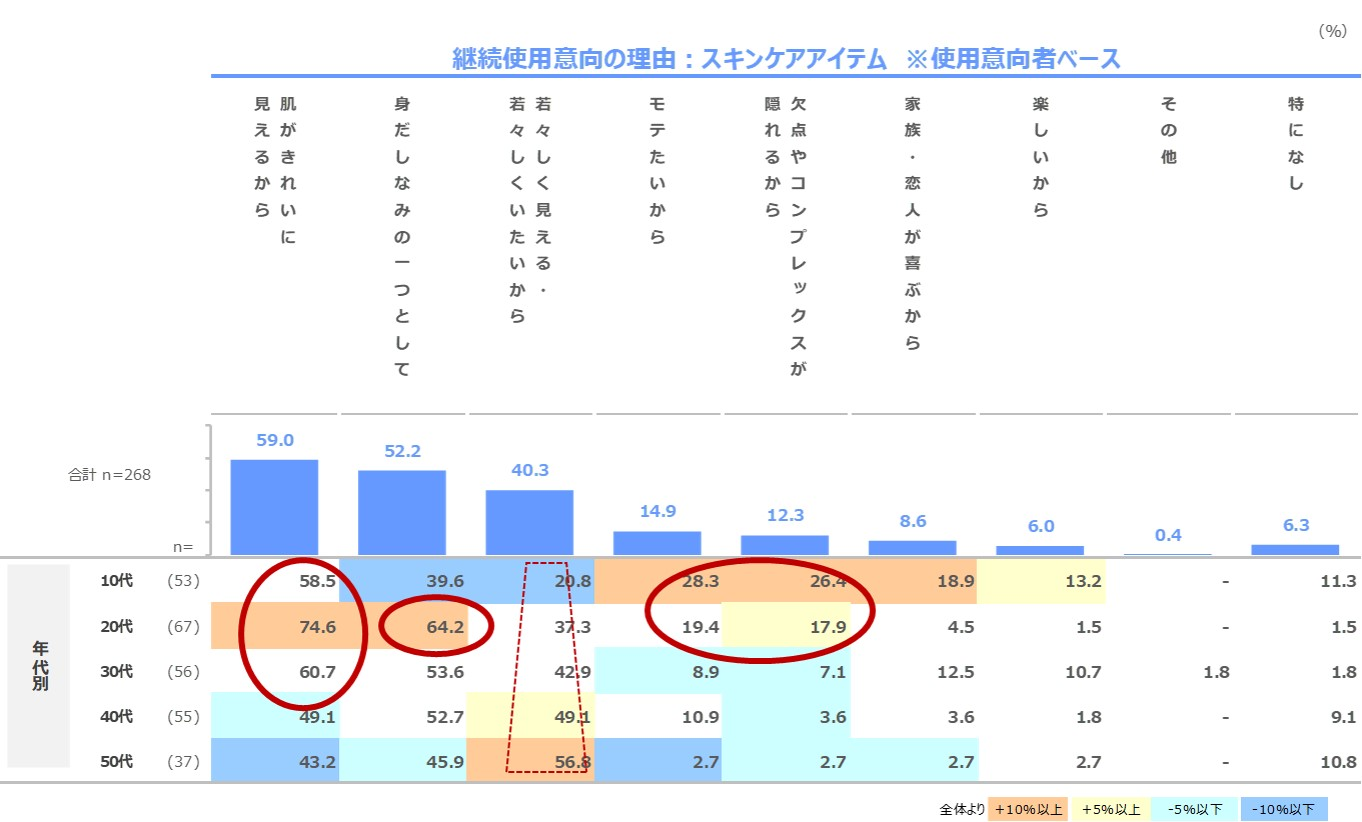 スキンケアアイテムの使用意向理由は、全体では「肌がきれいに見えるから」59.0%で最も多い理由。