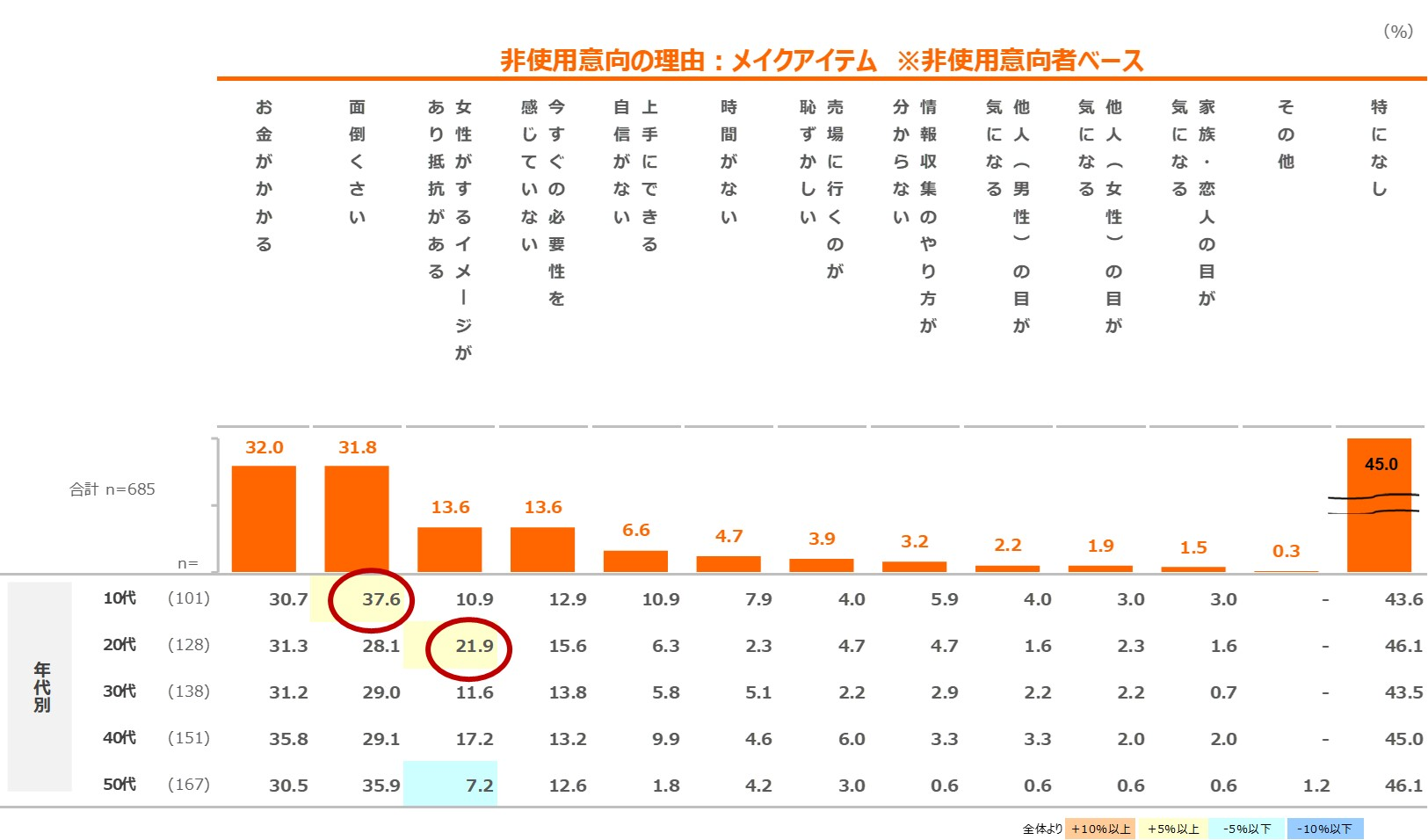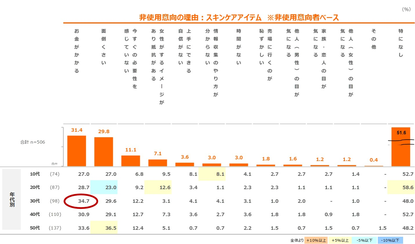 非使用意向理由では、全体でスキンケア・メイクアイテムとも「特になし」が51.6最も多い理由であるが、「お金がかかる」「面倒くさい」が3割挙がる。