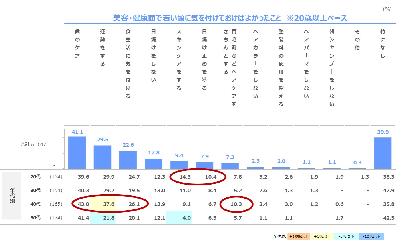 ■後悔先に立たず。美容の意識の高まりも過去の失敗を踏まえてのものかもしれません。20歳以上に限定して、美容・健康について、あなたが若い頃に気を付けておけばよかったことを聴取しました。その結果、「歯のケア」は各年代とも4割と最も多く挙げられました。年代別の特徴としては、40代で「歯のケア」「運動をする」「食生活に気を付ける」「育毛剤などヘアケアをきちんとする」が他の年代より相対的に多く挙がっており、身体への意識が高まる年代であることが理由だと推察されます。また、「スキンケアをする」「日焼け止めを塗る」は20代で最も多く、20代は特に肌への意識が高いといえそうです。(図表1)