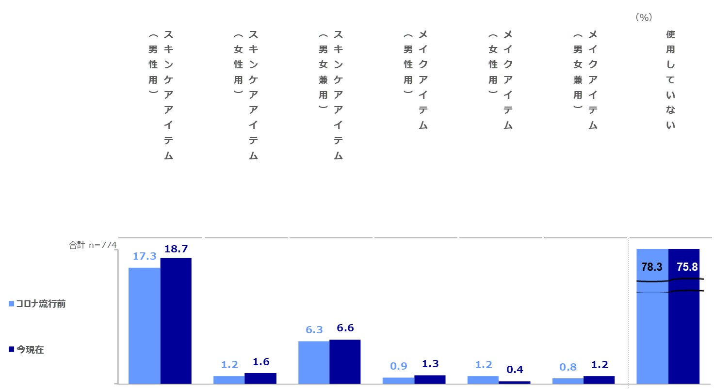 コロナ流行前と比較し、今現在のスキンケアやメイクアイテムの使用は微増傾向。10~30代の若年層、特に10代が伸長。