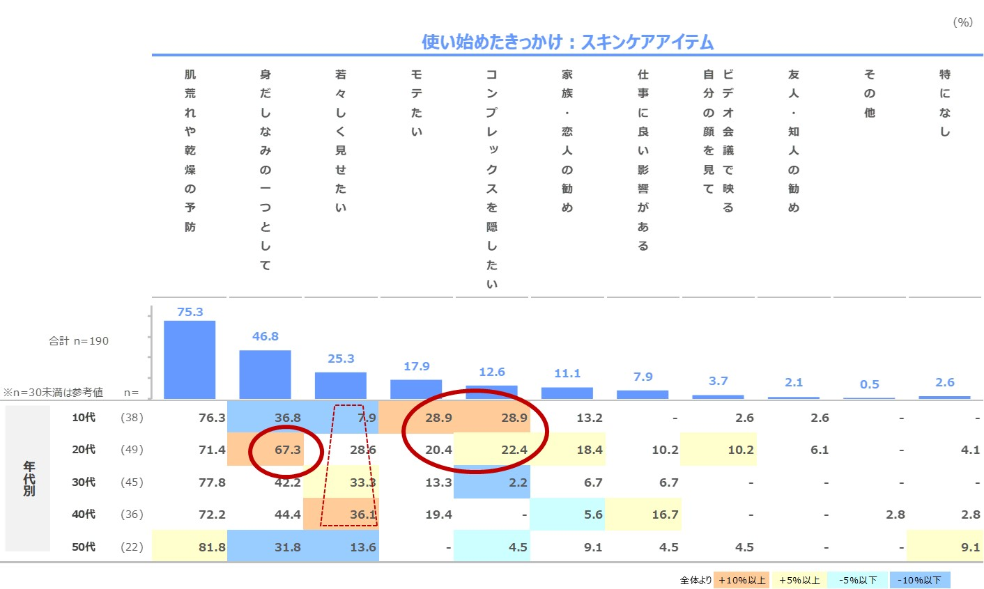 ■続いて、スキンケアアイテムを使いはじめたきっかけ聴取しました。スキンケアの年代別の特徴としては、社会人となる20代で「身だしなみの一つとして」が67.3%と他の年代と比較して最も多い結果となりました。また、「若々しく見せたい」は30代~40代で3~4割と多く挙げられました。一方、10・20代の若年層では「モテたい」「コンプレックスを隠したい」は2~3割とこちらも多めです。50代とは異なり、他人から見える自身の容姿を気にする傾向が見られました。(図表3)