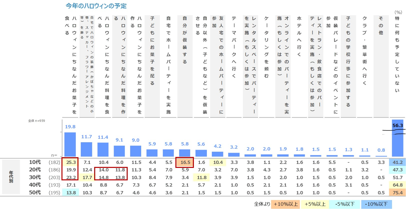 コロナの影響がなかった場合では、全体で「テーマパークへ行く」11.3%(+8.1pts)「友人宅でのホームパーティーに参加」9.2%(+5.0pts)など、特に10代を中心に外出を伴う行動が増える傾向です。一方で、「ハロウィンにちなんだお菓子を食べる」16.6%(▲3.2pts)「自宅でハロウィン装飾を飾る」9.0%(▲2.7pts)はやや減少しており、コロナ禍の影響で断念した行動があった半面、家で過ごすハロウィンを楽しむ人が増えたと推察されます。(図表2)(図表3)