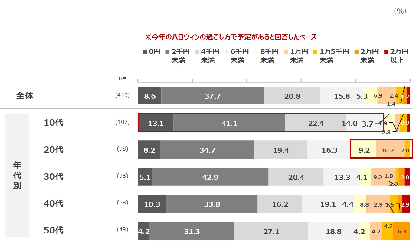 ■今年のハロウィンを楽しむ予定の人はいくら使うのでしょうか。別問では10代はハロウィンへの関心が最も高い結果でしたが、使用予定金額は「0円~6千円未満」90.6%と全世代で最も低コストとなり、お金をかけられないので、かけなくてもに楽しめることを模索している実態が浮き彫りになりました。「6千円以上」は、20代が21.4%と最も多いですが、30代以上の全世代で18.3~20.5%と大きな差はありません。(図表4)