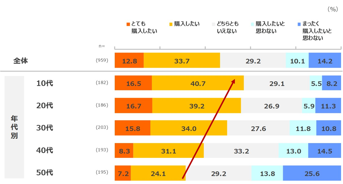 全体で「とても購入したい」「購入したい」46.5%と約半数に購入意向あり。食の関心同様、年代が下がるにつれて購入意向が高くなる傾向。