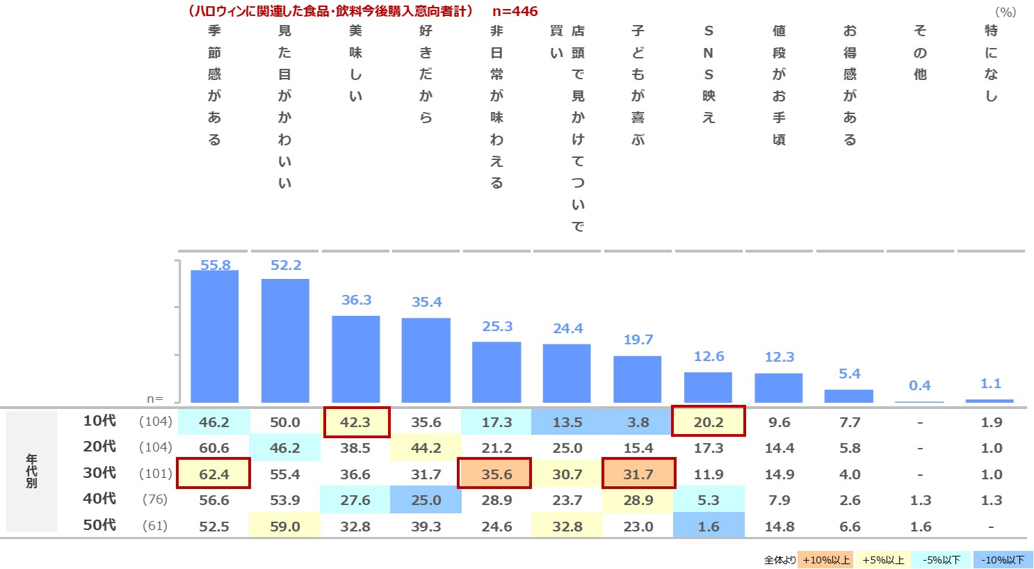 ■ハロウィン関連食品・飲料の購入意向者にその理由を聴取しました。その結果「季節感がある」「見た目がかわいい」が多く、全世代で5~6割が挙げました。10代は「季節感がある」46.2%とやや低いですが、「美味しい」42.3% 「SNS映え」が20.2%と他の年代よりも高い傾向です。また、30代では「季節感がある」62.4%「非日常が味わえる」35.6%「子どもが喜ぶ」31.7%が全世代で最も高く、「食」を通じて幼少期の子どもとハロウィンを通じて季節感を楽しんでいる傾向が見られます。(図表6)