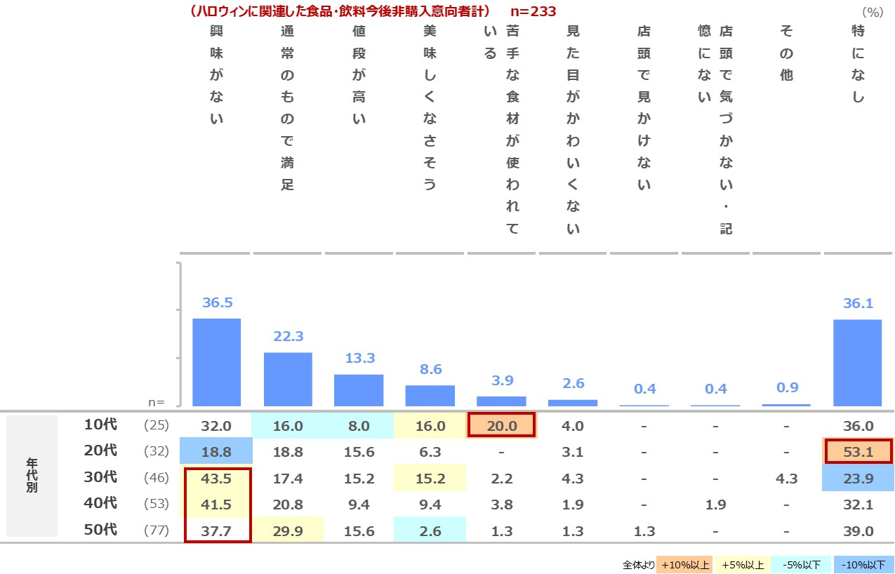 ■反対にハロウィン関連食品・飲料を「購入したいと思わない」と回答した方にその理由を確認しました。その結果「興味がない」が30代以上で4割と高く挙がりました。年代別では10代では「苦手な食材が使われている」20.0%と高く、具体的な食材名までの聴取はしていませんが気になる傾向が見られました。「特になし」も全体で36.1%と一定数存在し、20代で53.1%と最も高い結果です。(図表7)