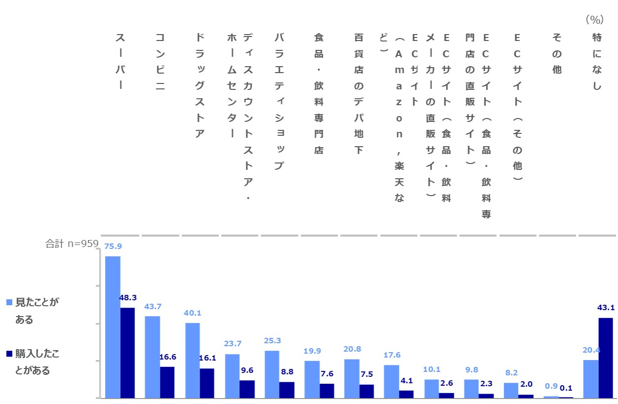 「見たことがある」「購入したことがある」ともに「スーパー」が最も多く、「コンビニ」「ドラッグストア」と続く。