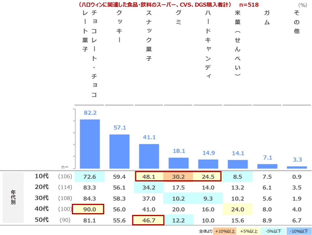 「チョコレート・チョコレート菓子」が82.2%と最も多いが、10代では「スナック菓子」「グミ」なども購入されている傾向。