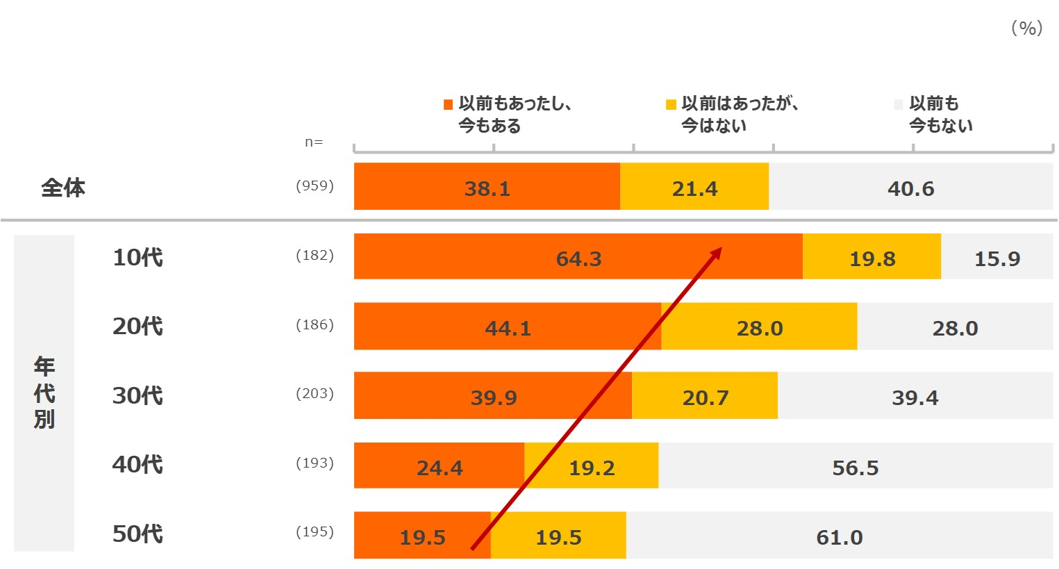 興味があるのは4割弱に留まり、「以前も今もない」が40.6%。「以前はあったが今はない」まで入れると6割強が現在興味がないと回答。興味があるのは若年層ほど多い。