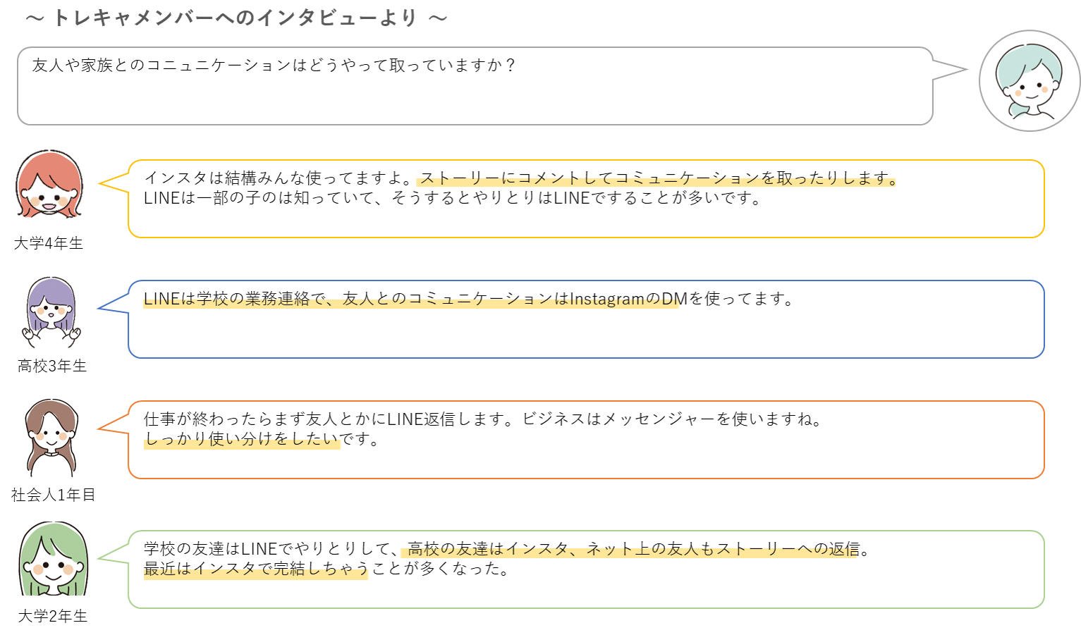 Z世代はInstagramをコミュニケーション面でどう活用しているのか?普段のInstagramを使ったコミュニケーションについて、女子大生・女子高生マーケティング集団「トレキャ」メンバーへ、インタビューで聞いた内容を抜粋してみてみましょう。