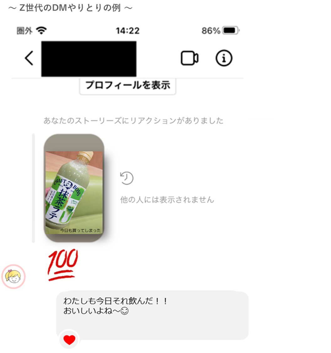 ストーリーズ機能で日常を送り合うZ世代のコミュニケーションは、内容への気軽な反応やいいねから繋がることが多いようです。1つ例をご紹介しましょう。下の画像はZ世代のDM上の何気ない日常のやりとりを再現したものです。