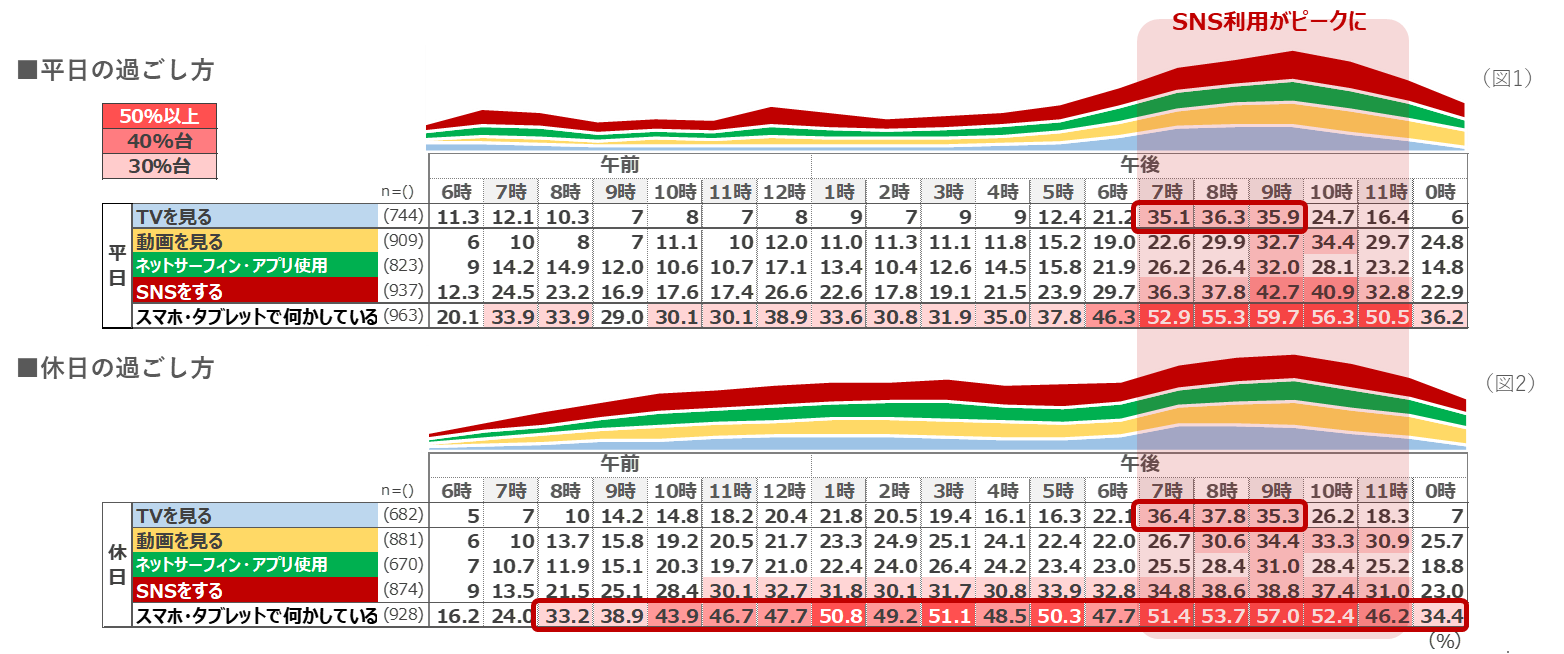 TVが午後7時から9時までの限られた時間帯でしか見られていないのとは対照的な実態が浮き彫りになりました。また「動画を見る(YouTubeなど)」も、SNSに比べると時間は限定的な使用の傾向が見られます。
