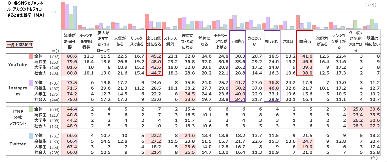 Z世代は各SNSへどんな内容を求めているのでしょう。探るべく、チャンネル・アカウントをフォローする基準を聞きました。(図4)どのSNSでも基本的に、必要に応じて興味がある内容を中心に活用しているようですが、特徴が分かれる結果がでました。