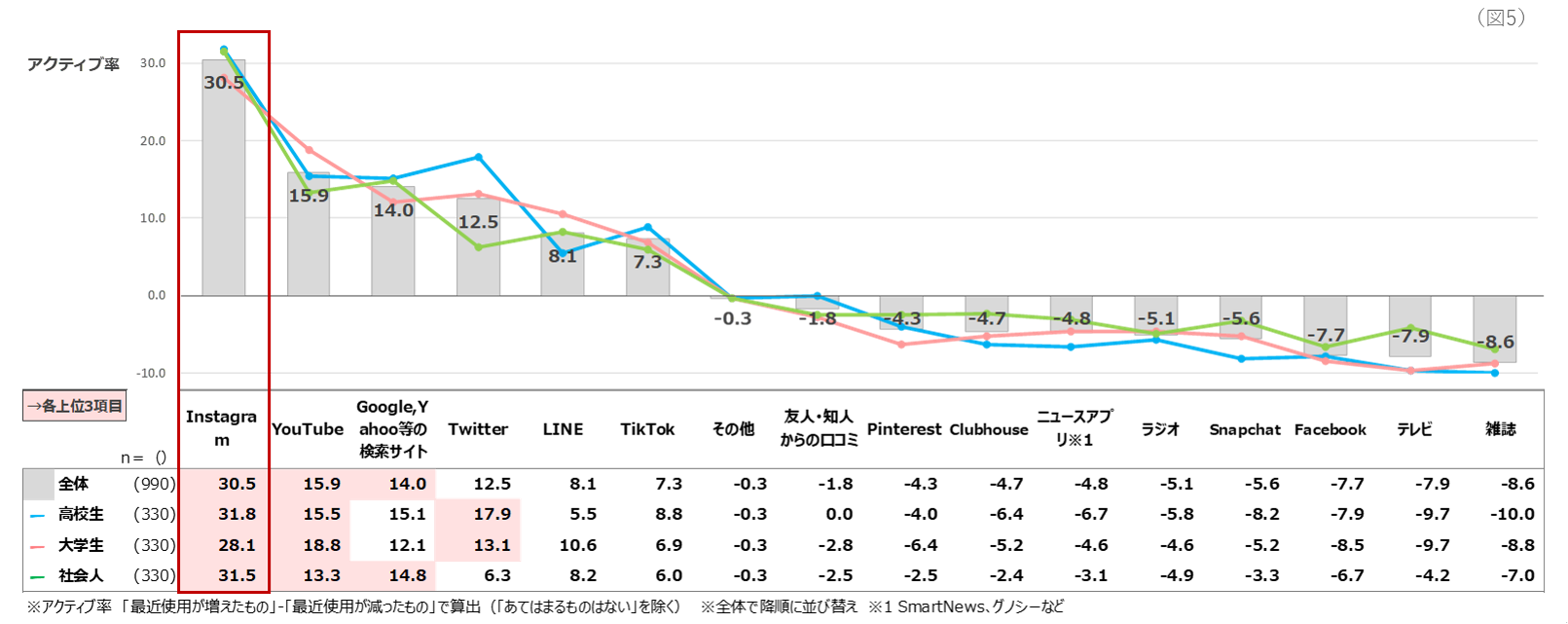 今度は、Z世代に聞いた「最近使用が増えた、減ったSNSや媒体」を足し引きしてアクティブ率を算出し、Z世代が今最も活用しているSNSなどを確認してみました。(図5)