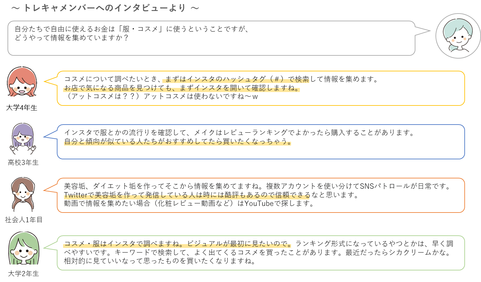 Z世代のInstagram活用術が気になるところです。普段のInstagramを使った情報収集について、女子大生・女子高生マーケティング集団「トレキャ」メンバーへ、インタビューで聞いた内容を抜粋してみてみましょう。
