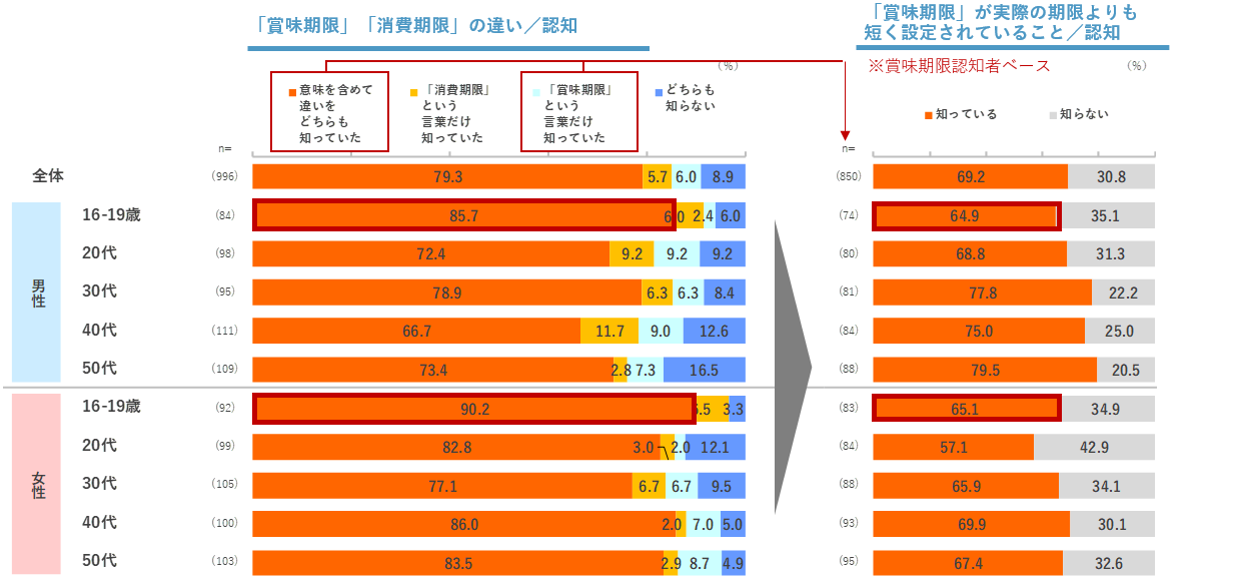 「意味を含めて違いをどちらも知っていた」は全体で8割、特に男女とも10代が9割と各世代で最も高い。一方で、「賞味期限」が実際の期限より短く設定されていることの認知は全体で7割。10代は言葉の認知が高いが、「賞味期限」の設定期限の認知は男女とも全体(69.2%)より下回る。