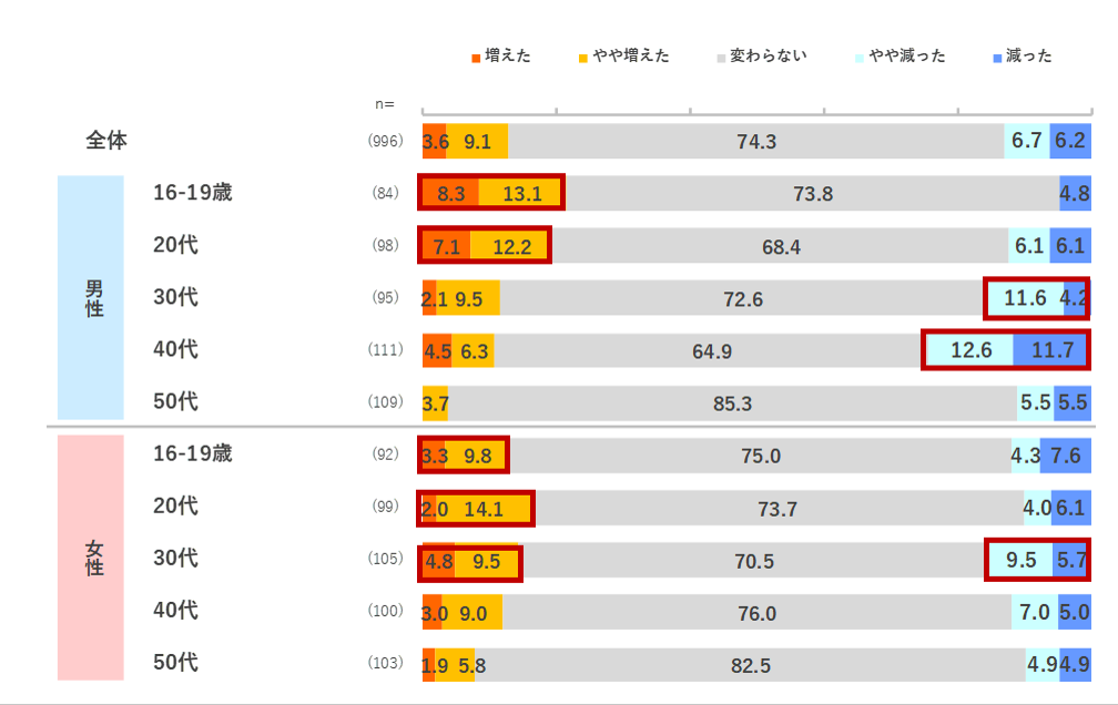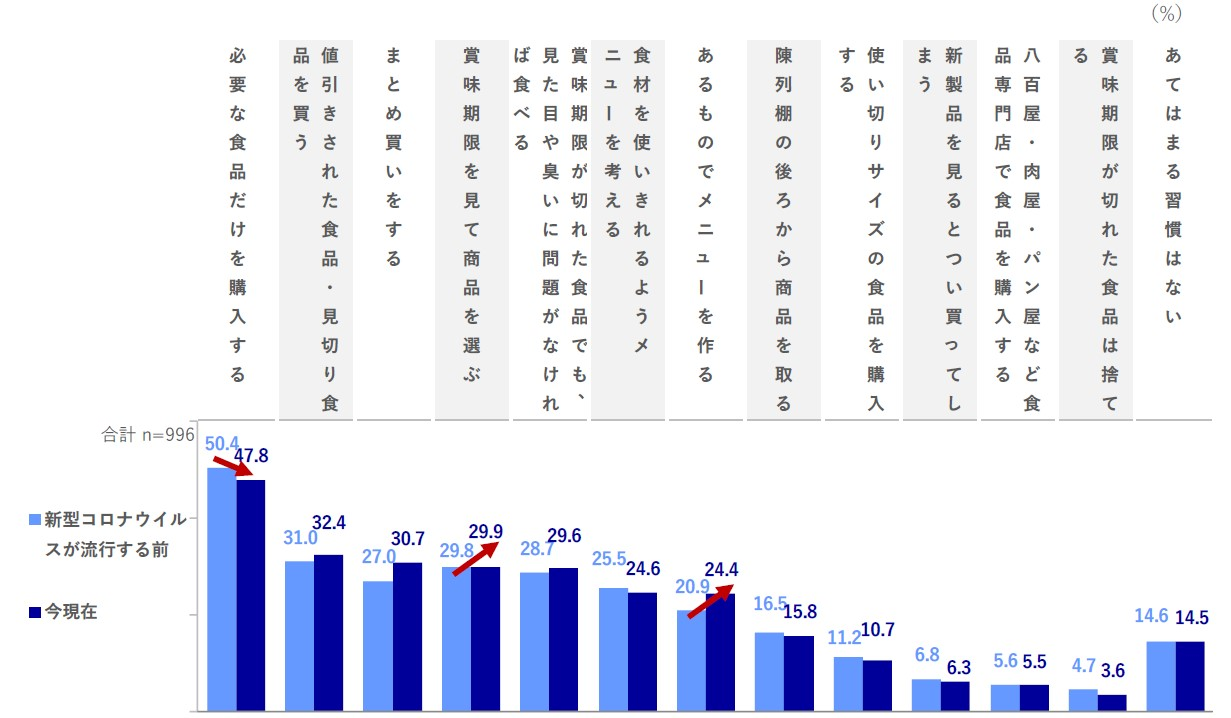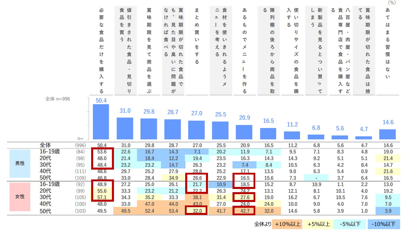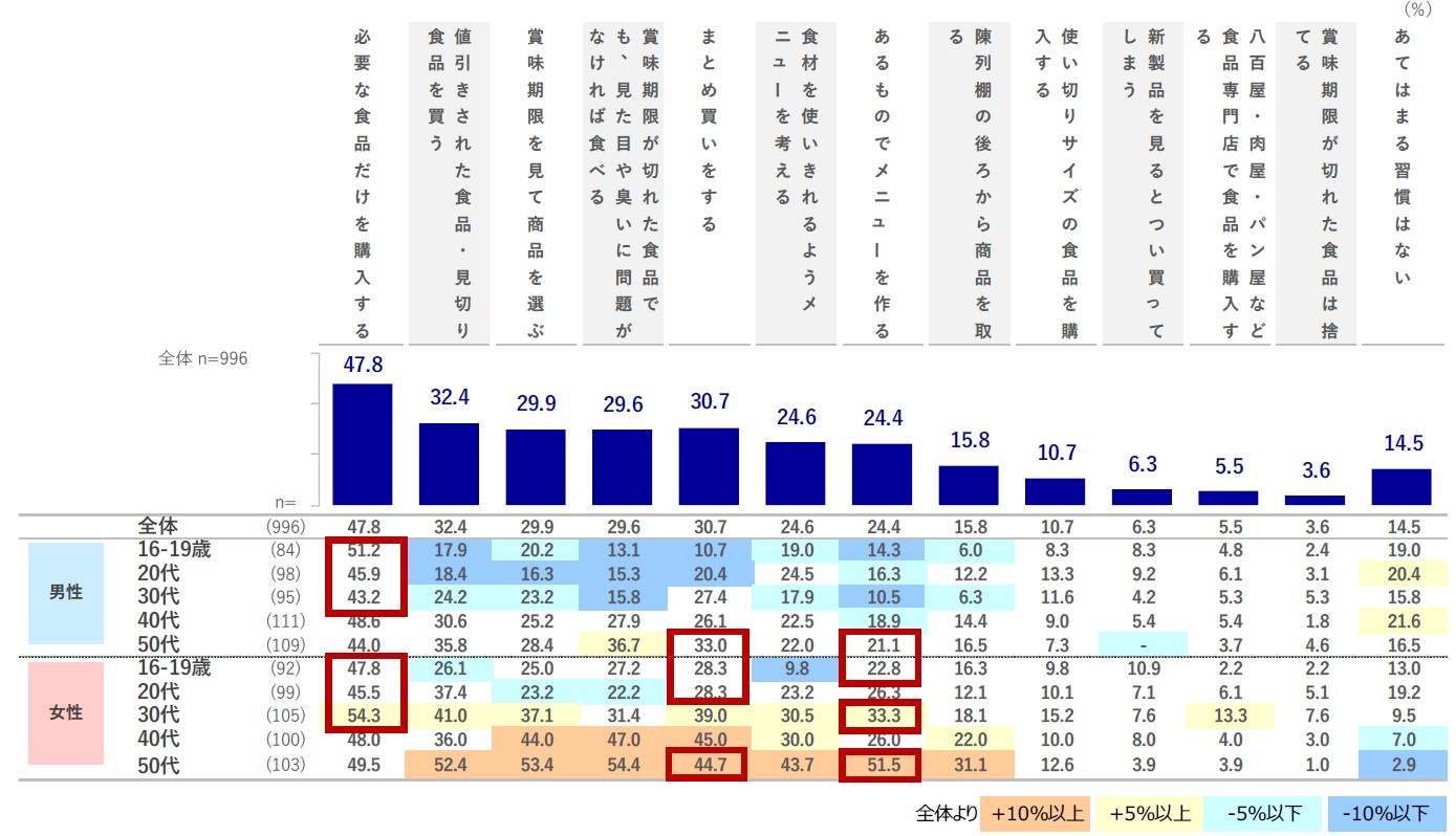 コロナ流行前と比較して、「まとめ買い」「あるものでメニューを作る」が+3.5~3.7pts。女性の若年層を中心に、コロナ禍を経て効率的な習慣が上昇。一方で「必要な食品だけを購入する」が▲2.6pts。