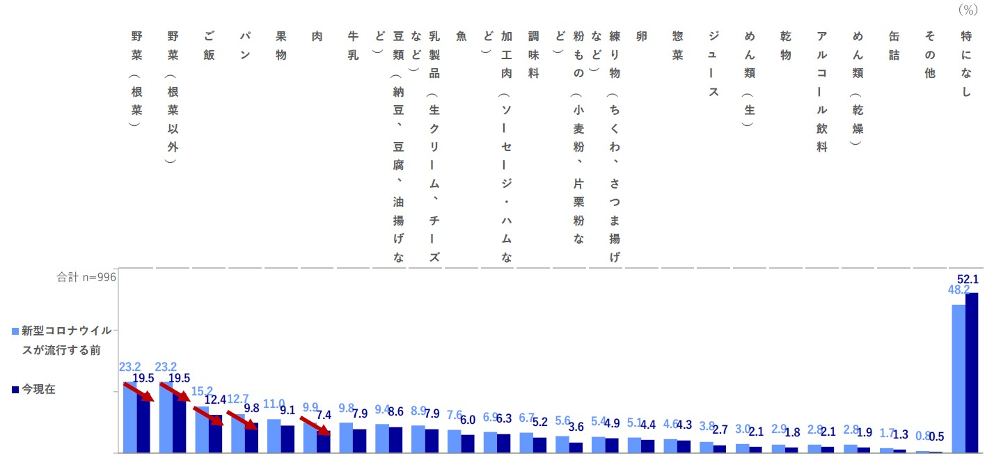 コロナ流行前も今現在も「特になし」が半数だが、コロナ流行前と比較して「野菜(根菜)」「野菜(根菜以外)」「ご飯」「パン」「肉」が▲2.5~3.7ptsと、主食・主菜に使われる食材の廃棄が減少。