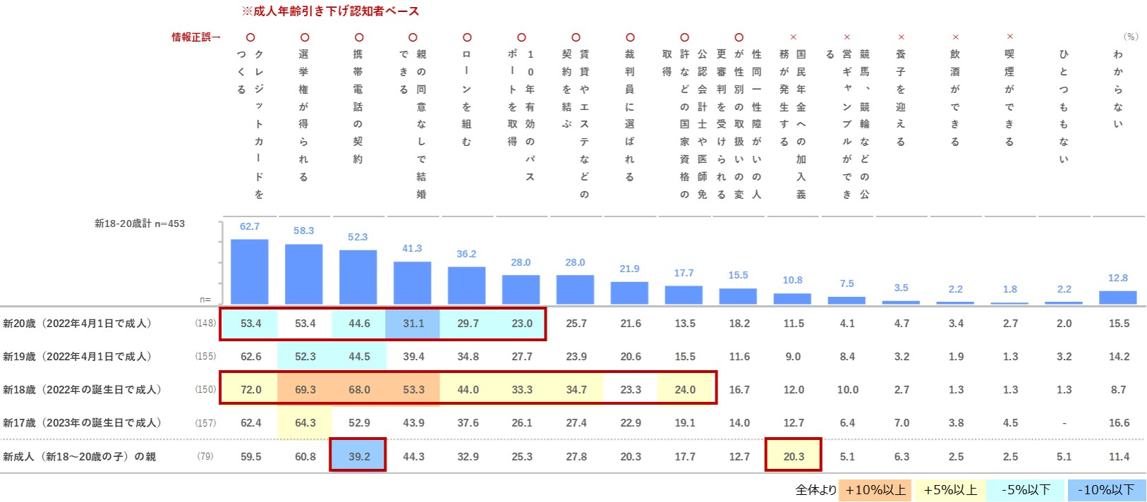 成人年齢引き下げの具体的内容について、どの程度認知されているのか把握する為、間違った情報も含めて呈示して確認をしました。その結果、年齢別では新18歳の認知が高い傾向にある一方で、新20歳は低い結果となりました。新18歳は、特に「選挙権が得られる」「携帯電話の契約」「親の同意なしで結婚できる」が新18~20歳より11pts以上高くなっています。新成人の親は新18~20歳 と比較して、「携帯電話の契約」が▲13.1ptsと大きな差が見られました。また「国民年金への加入義務が発生する」で+9.5ptsと、年金加入への誤認が高くなっています。