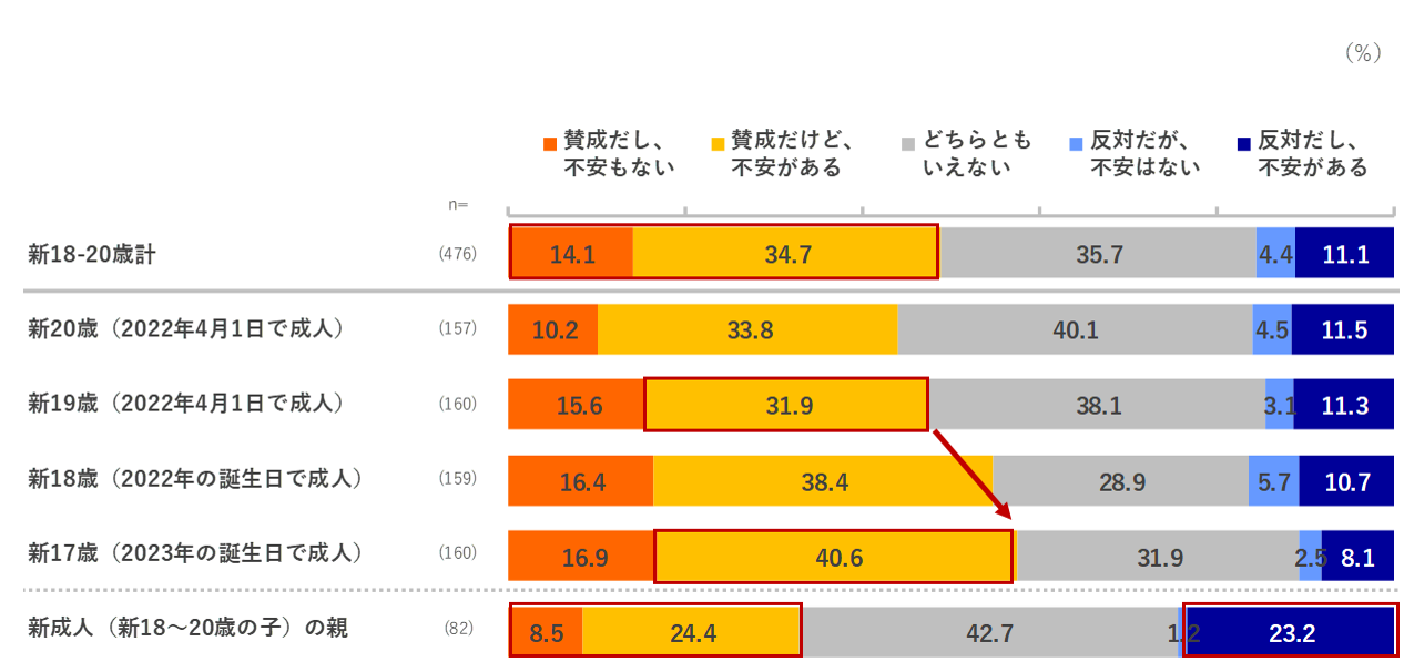年齢別では、「賛成だけど、不安がある」が新19歳から新17歳と年齢が下がるにつれて増える傾向です。「新成人の親」は「反対だし、不安がある」が23.2%と最も高く、新18-20歳より+12.1ptsとなっています。また、内容への理解不足と今後どのような影響があるのか未知数なところが相まってか、「どちらとも言えない」も42.7%(+7.0pts)と最も高くなっています。