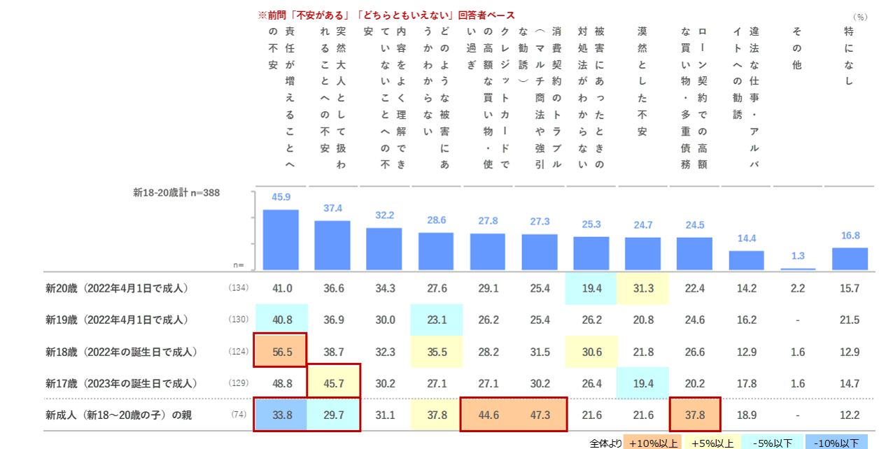 新18~20歳は「責任が増えることへの不安」45.9%や、「突然大人として扱われることの不安」37.4 %と精神面での不安が上位。一方で、「新成人の親」は「消費契約のトラブル」47.3% 、「クレジットカードでの高額な買い物」44.6%など消費トラブルへの不安を挙げる。