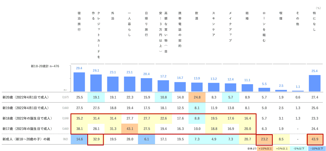 新18~20歳は上位に「宿泊旅行」29.4%、「クレジットカードを作る」26.1%、「外泊」「一人暮らし」23.1%と、外向きの行動を中心に自由にしたいと考えている。一方で「新成人の親」は、「クレジットカードを作る」32.9%、「ローンを組む」23.2%など金銭面の許可の必要性を挙げるが、「特になし」も43.9%挙がる。