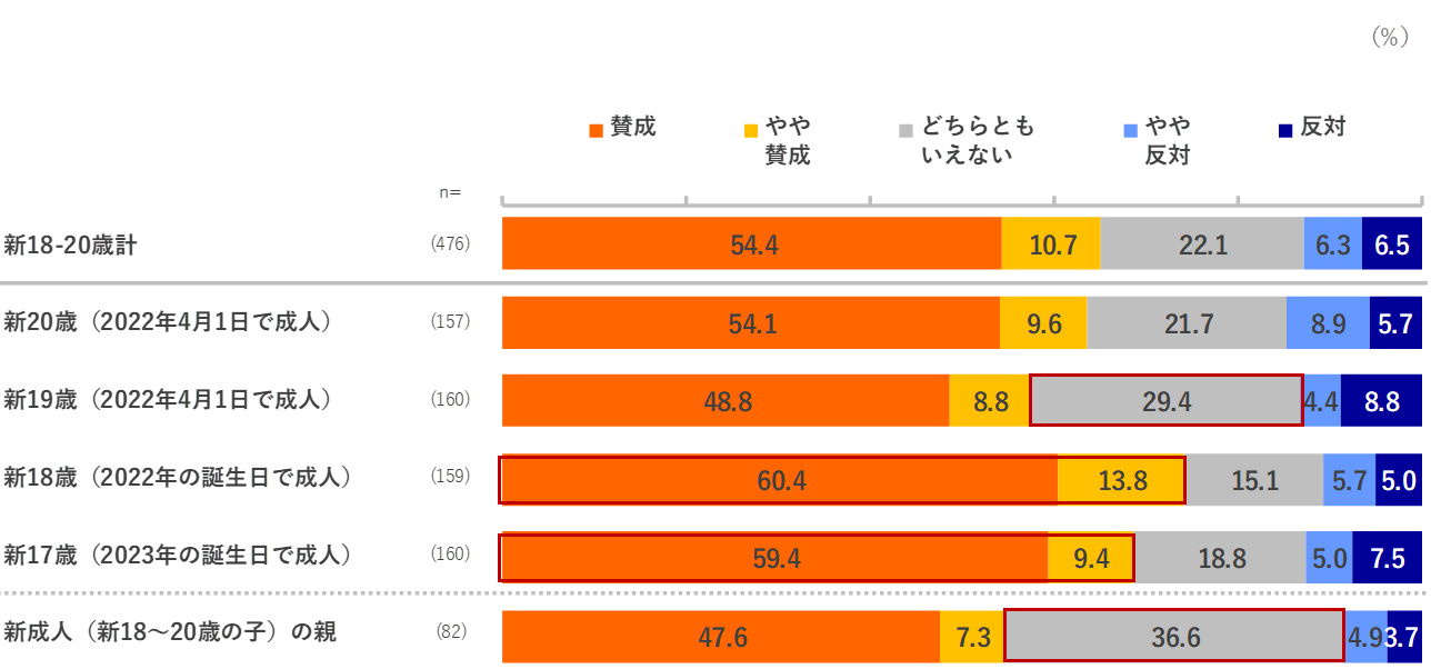 新18~20歳は48.8%が賛成だが、うち「賛成だが不安がある」が34.7%と不安を感じる新成人が3割を超える。新成人の親の賛成は32.9%と新18~20歳より▲15.9ptsであり、 「反対だし、不安がある」が23.2%と最も高く、親世代の不安が読み取れる。