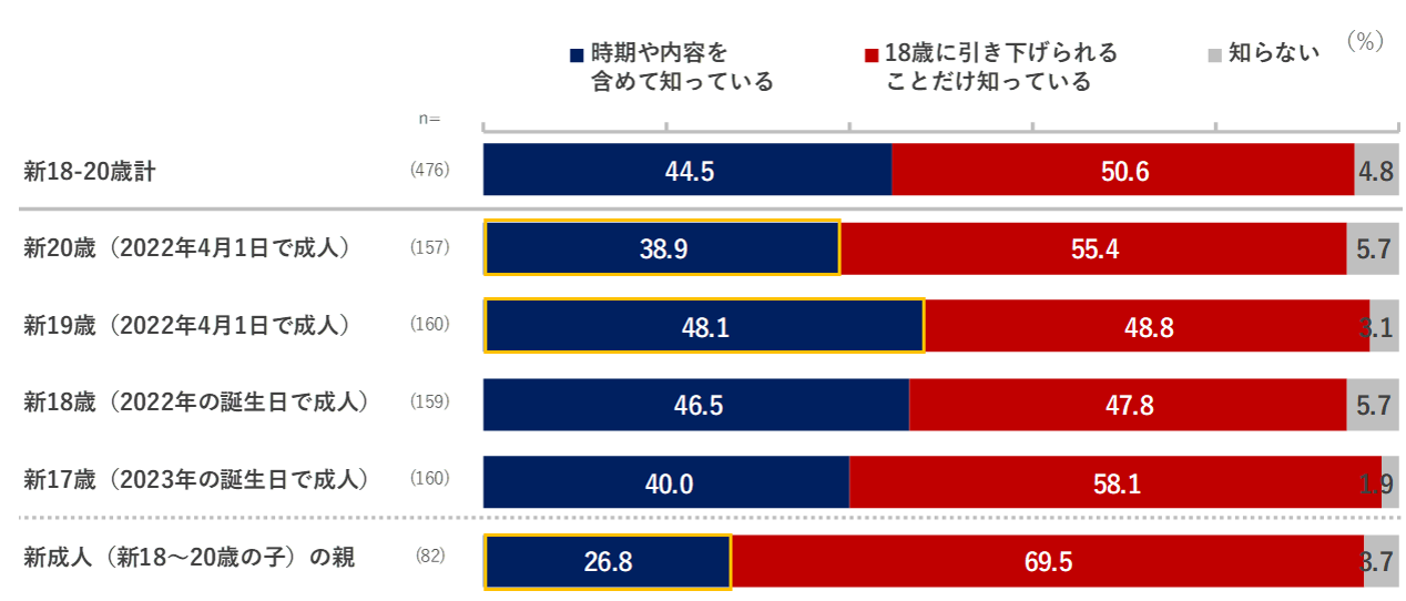 新18~20歳、新成人の親とも引き下げの認知は95%以上と大多数。但し、 新18~20歳の詳細内容理解は4割、新成人の親は3割に留まる。