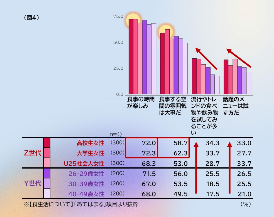続いて、食事の場にどのようなことを求めているのかに注目すると、「食事の時間が楽しみ」「食事をする空間の雰囲気は大事だ」が多く挙げられていることが目立ちます。食事をする間は、SNSの先にいる人々はいないため、目の前にいる人とのコミュニケーションを重視していることが窺えます。また「流行やトレンドの食べ物や飲み物を試してみることが多い」「話題のメニューは試す方だ」もY世代と比べて回答が多く、食事をする店を選ぶ際の重視点と思われます。 (図4)