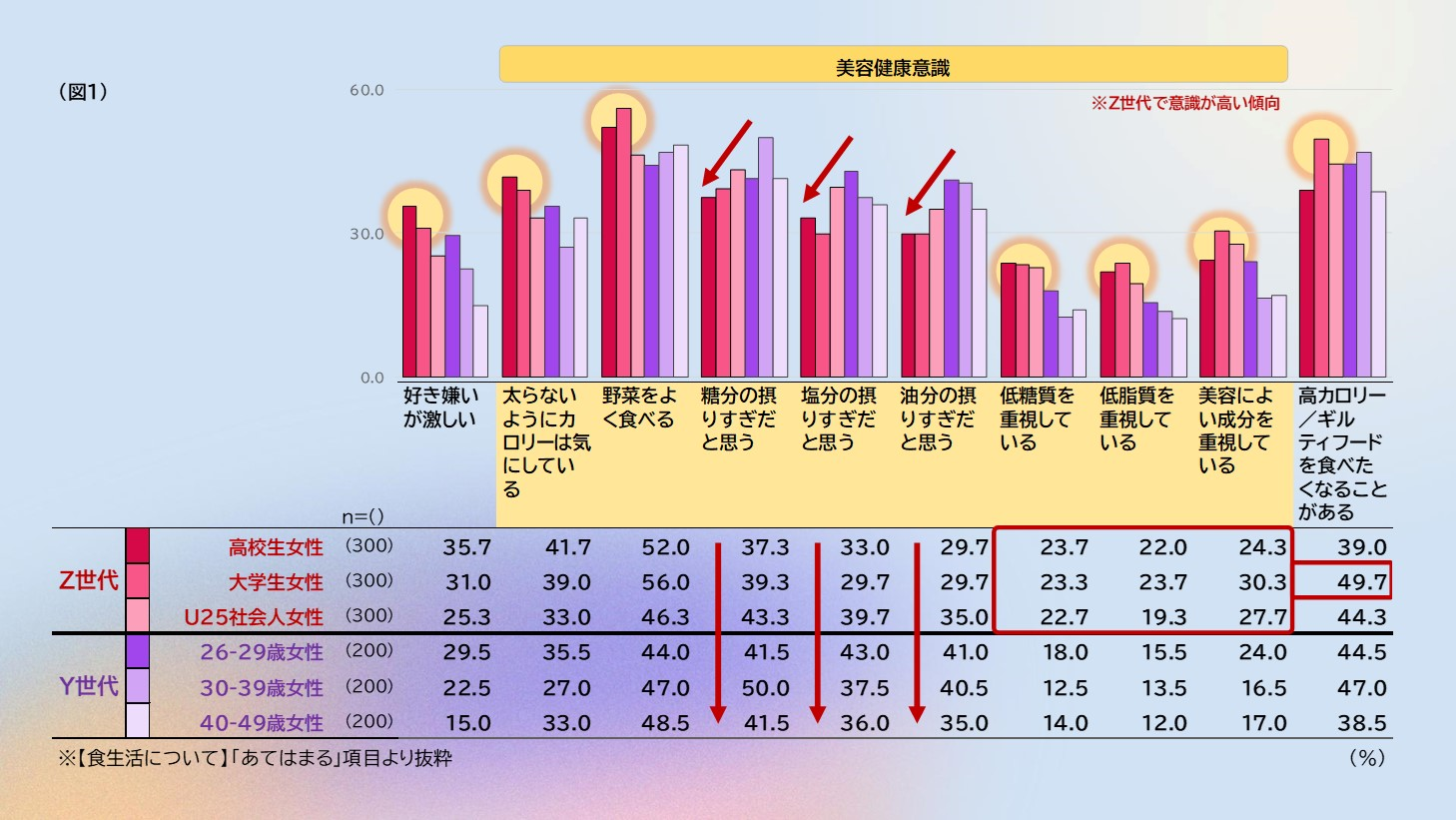まず彼女たちの食意識や行動についてみていきます。(図1)Z世代の回答傾向からは、「好き嫌いが激しい」という自覚が高校生を中心にY世代と比べあるようです。しかし、野菜をよく食べ、糖分・塩分・油分を控え目に、低糖質・低脂質を意識する、といった好き嫌いがあまり見えにくい食への高い自己管理意識が、Z世代の回答から垣間見えます。太らないようにカロリーを気にしつつ、美容に良い成分も重視して摂取するなど、Y世代と比べて食意識の高さ=美意識の高さがあるのでは?と思わせるような回答結果となりました。