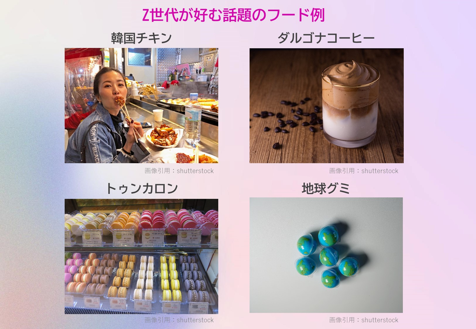 また、韓国ではないですが「地球グミ」もZ世代からは多く挙げられました。正式にはドイツTrolli社の「Planet Gummi(プラネットグミ)」が名称で、2021年にZ世代だけでなく、子供からもSNS人気を集め、品切れが相次いでいたグミの事です。パキッという容器を開けるときの割れる音や青いグミの登場の見栄え、食べると舌が青くなる様子などから、喫食している様子がSNSに多くあげられ、品切れ続出の商品です。