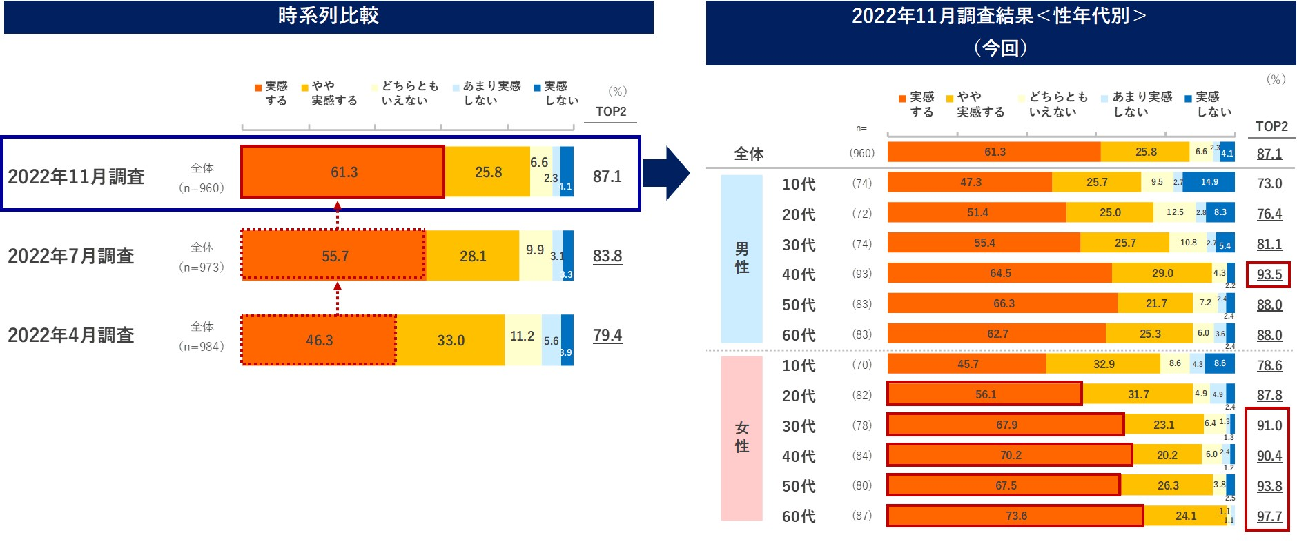 性年代別でみると、女性20代以上では、いずれの年代においても「実感する」と回答する割合が男性を上回っています。なお、男性40代、女性30代以上では「TOP2」(実感する+やや実感する)が9割を超える結果となっており、他層をやや上回りました。