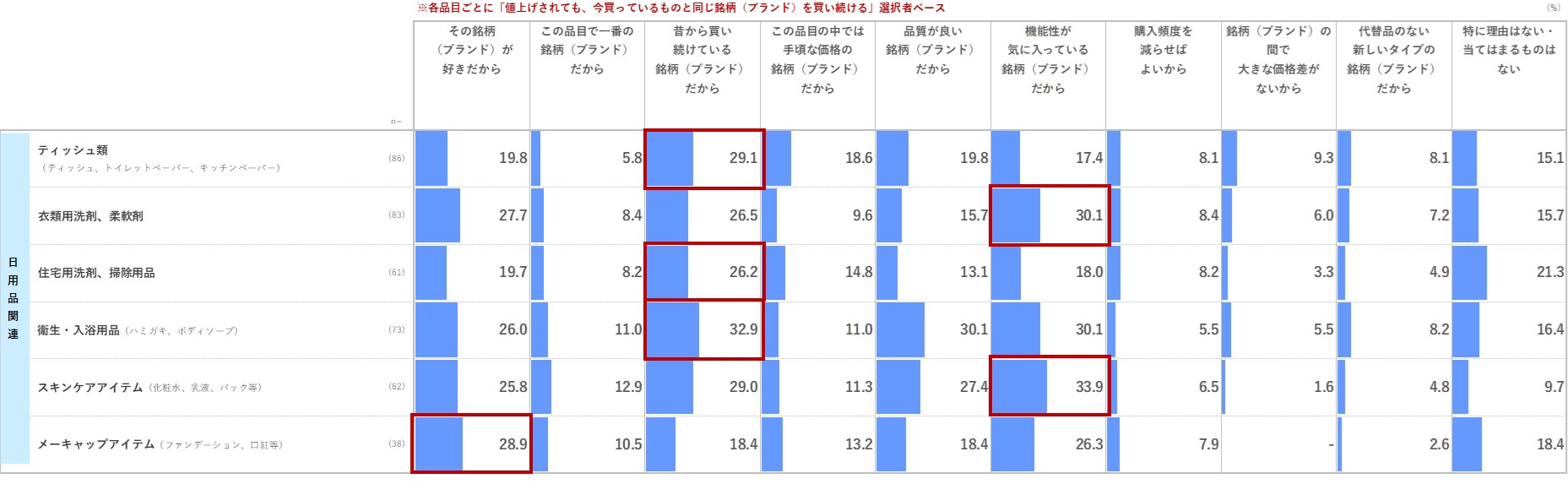 値上げされても同じ銘柄(ブランド)を買い続けると回答された日用品関連の品目について、その理由を確認したところ『ティッシュ類』『住宅用洗剤、掃除用品』、『衛生・入浴用品』では「昔から買い続けている銘柄(ブランド)だから」が、『衣類用洗剤、柔軟剤』『スキンケアアイテム』では「機能性が気に入っている銘柄(ブランド)だから」が、『メーキャップアイテム』では「その銘柄(ブランド)が好きだから」が最も高くなっており、品目による違いが顕著となっている。