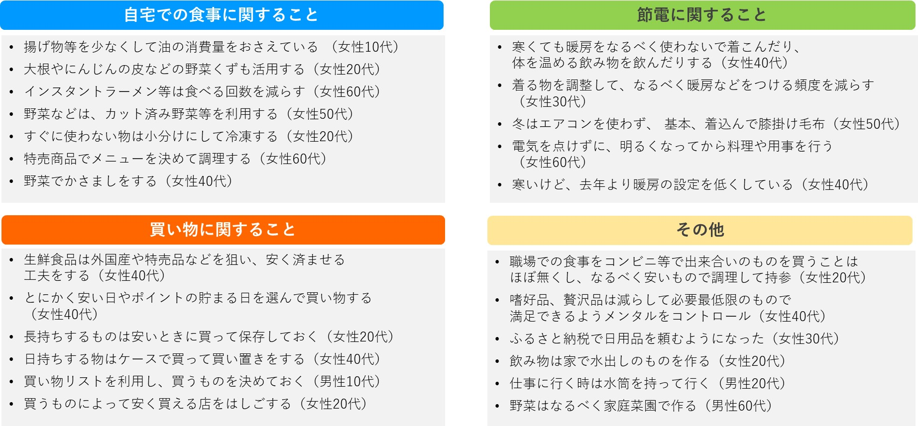 大きく分類すると、「自宅での食事に関すること」「買い物に関すること」「節電に関すること」と分けられ、生活の知恵が様々な内容で見られた。