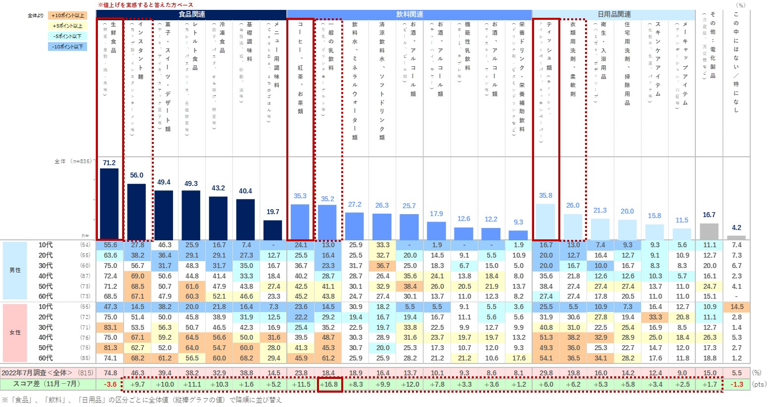時系列でみると、11月調査では「生鮮食品」以外のすべての品目において、値上げを実感する割合が7月調査を上回る結果となっています。なお、「一般の乳飲料」では16.8ポイントの差となっており、他の品目に比べ、スコア差が目立っています。