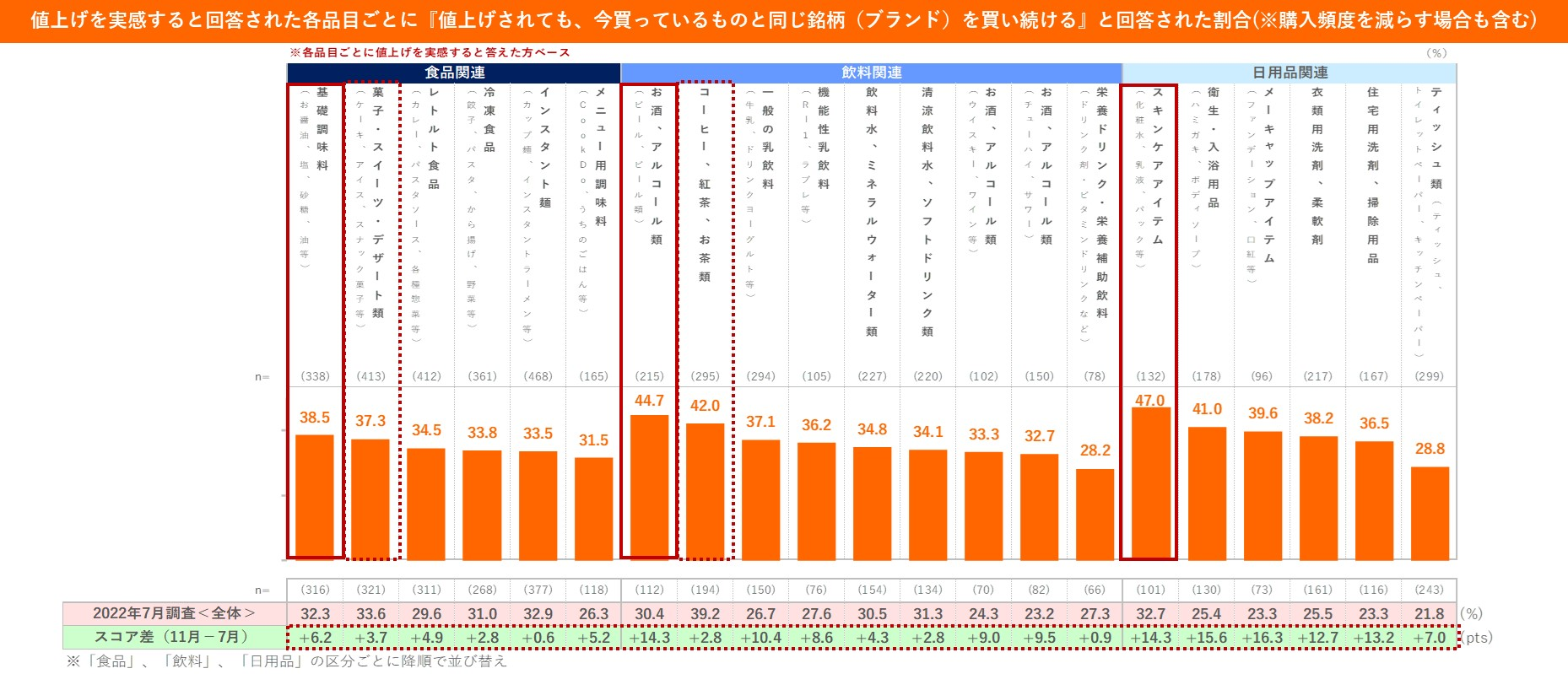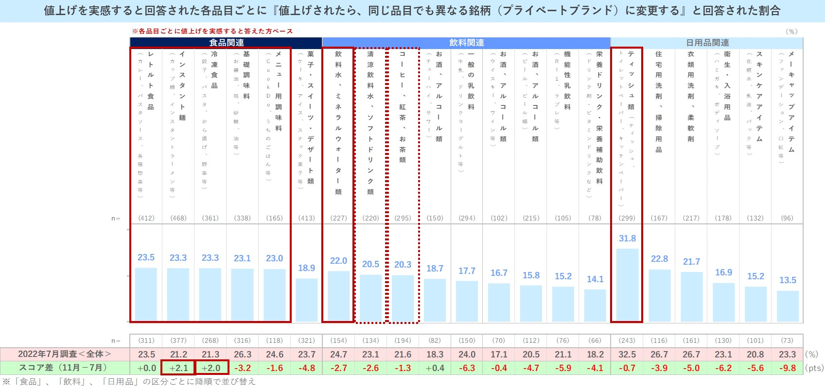 時系列でみると、11月調査では、すべての品目において7月調査を上回る結果となっています。今年に入ってからの値上げの影響により、既に各品目ブランドスイッチし、切り替えた製品を引き続き買い続けたいという意向を持つ人も含まれている可能性がありそうです。