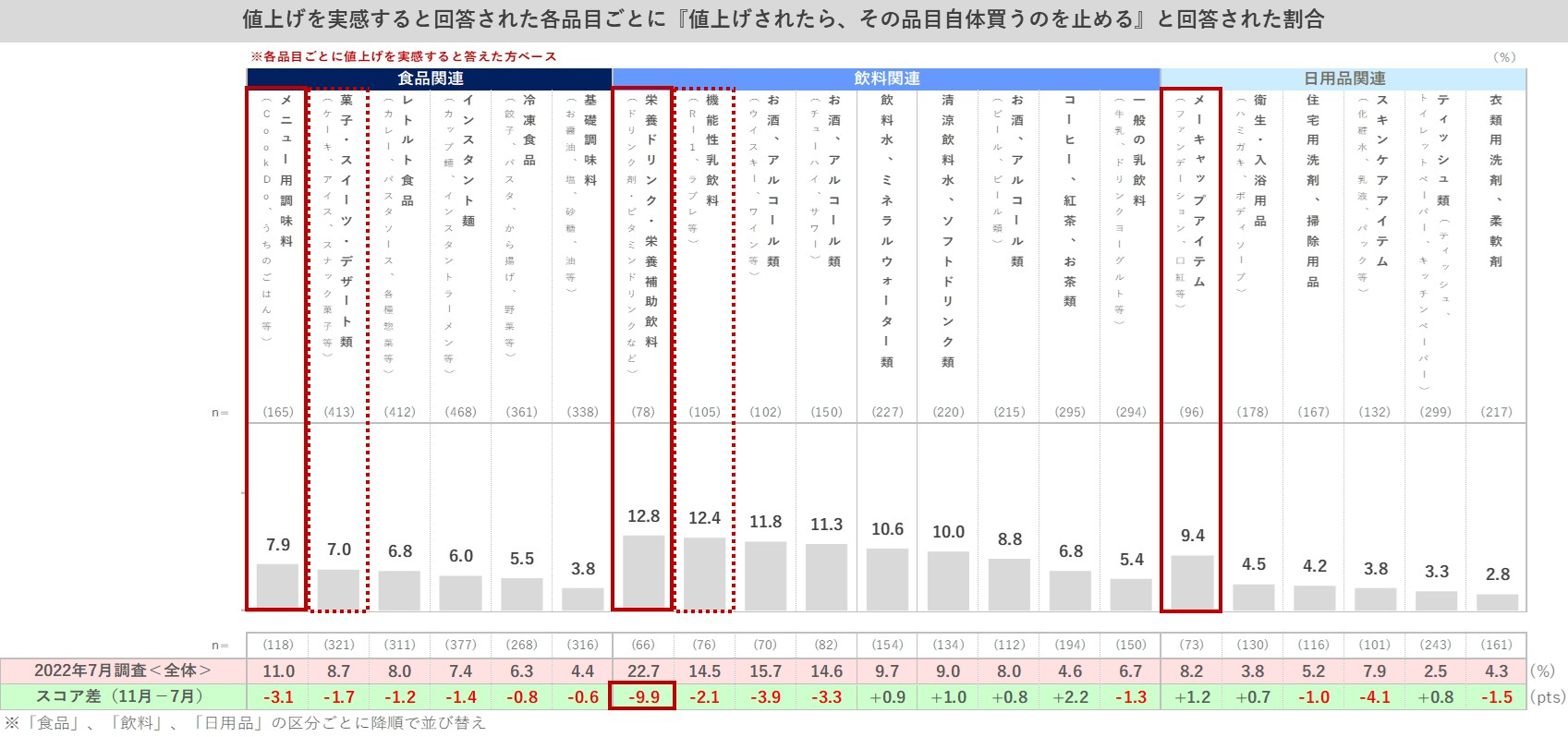 値上げを実感すると回答された品目ごとに『値上げされたら、その品目自体買うのを止める』と回答された割合をみると、食品関連では「メニュー用調味料」が7.9%と最も高く「菓子・スイーツ・デザート類」(7.0%) が次いでいる。飲料関連では「栄養ドリンク・栄養補助飲料」が12.8%と最も高く「機能性乳飲料」が12.4%と僅差で続く。日用品関連では「メーキャップアイテム」が9.4%で他の品目を上回る結果となっている。