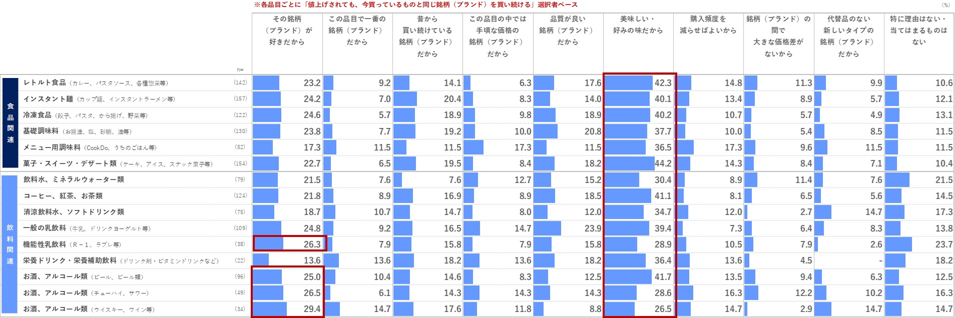 値上げを実感すると回答された品目ごとに、『値上げされても、今買っているものと同じ銘柄(ブランド)を買い続ける』と回答された割合をみると、食品関連では「基礎調味料」が38.5%と最も高く「菓子・スイーツ・デザート類」(37.3%) が続く。飲料関連では「お酒、アルコール類」が44.7%と最も高く「コーヒー、紅茶、お茶類」(42.0%)が次いでいる。日用品関連では「スキンケアアイテム」が47.0%で他の品目を5ポイント以上上回る。
