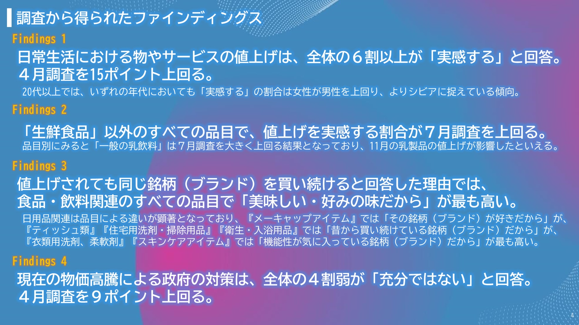 今回の調査では、値上げの影響が生活者のブランドスイッチにどう影響するのかを確認しました。時間の経過とともに値上げの実感値が高まっている様子が窺えます。また、前回までと異なる傾向として、値上げが続いた結果ブランドスイッチが起こり、スイッチ先の新たなブランドで固定購買している様子も一部垣間見えました。当社では、様々値上げがもたらす生活者の意識と行動の変化がどういったものなのか、今後もウォッチしてまいりたいと思います。