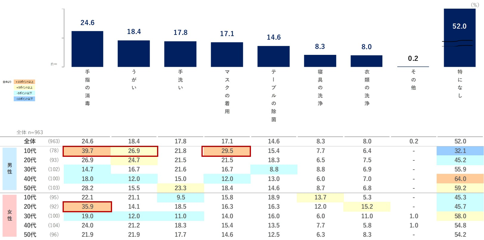 「手指の消毒」24.6%、「うがい」18.4%、「手洗い」17.8%など、一部の感染予防対策の頻度が減少した人が約2割。 一方で、「特になし」が52.0%、半数が頻度が減った行動はないと回答。