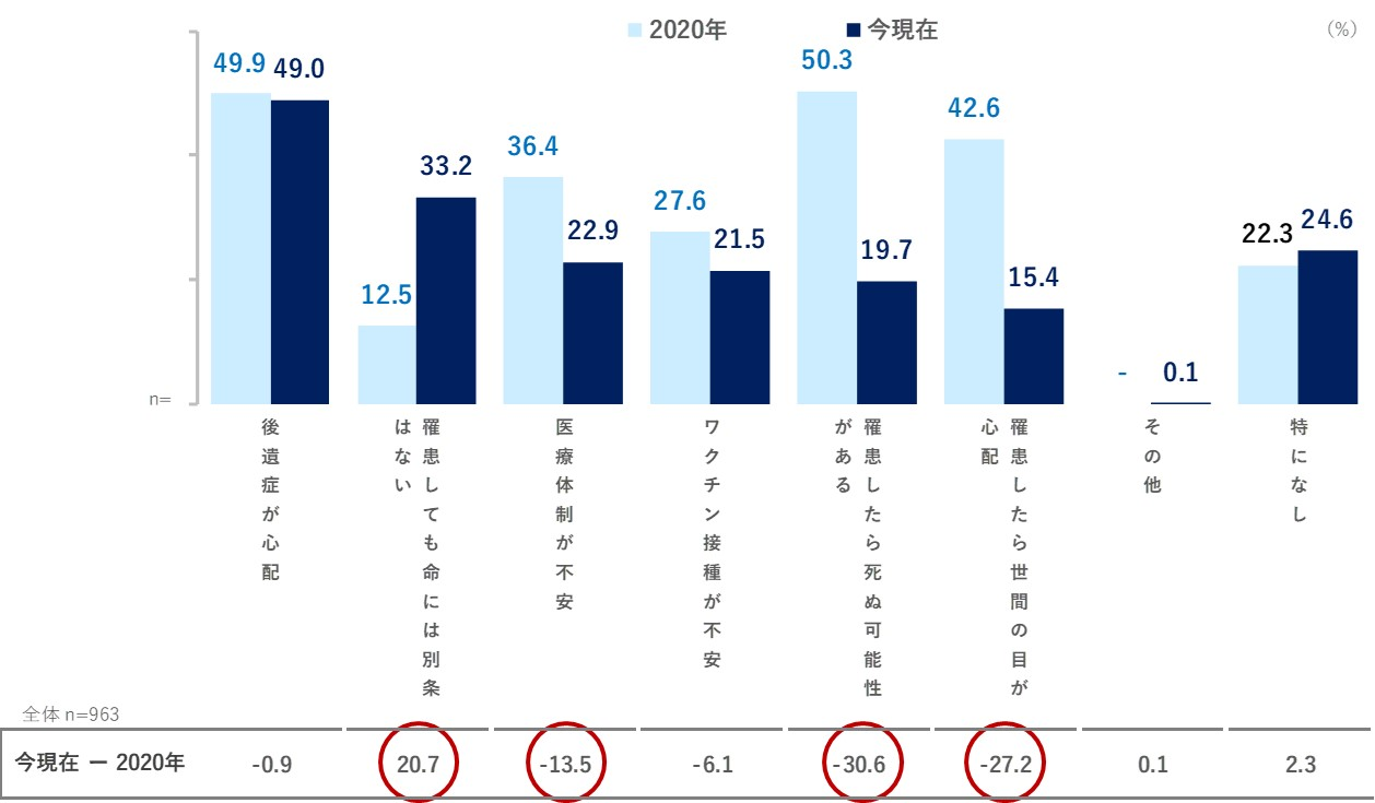2020年と比較し、「罹患したら死ぬ可能性がある」▲30.6pts、「罹患したら世間の目が心配」▲27.2pts、「医療体制が不安」▲13.5ptsと大幅に減少。